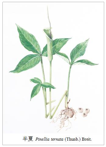 半夏為天南星科半夏屬植物半夏Pinellia ternata (Thunb.) Breit.的干燥塊莖,主產(chǎn)于四川、湖北、河南、貴州、安徽等省。溫,辛,有毒。脾、胃經(jīng)。功效:燥濕化痰,降逆止嘔,消痞散結(jié)。