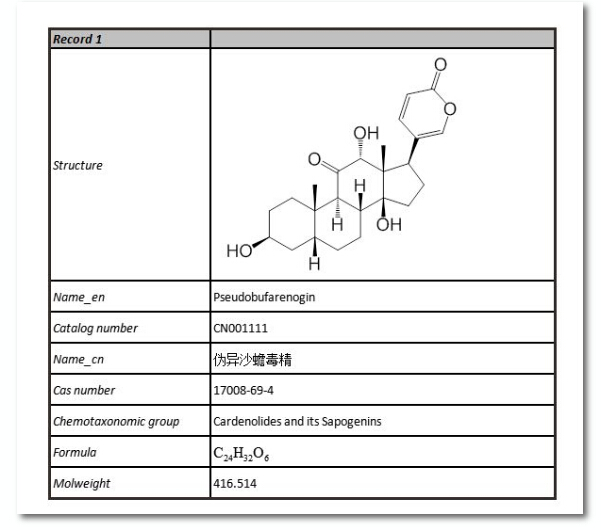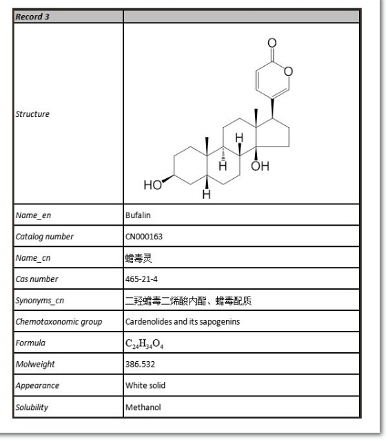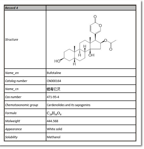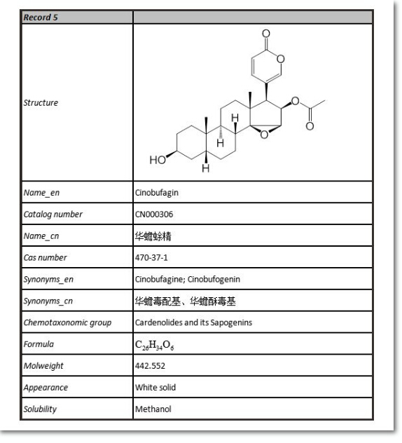 普思生物是一家專業(yè)從事天然藥物分離純化并提供藥物技術(shù)研究服務(wù)的國家高新技術(shù)企業(yè)。目前我司共有20多種蟾酥系列活性成分——酯蟾毒配基、蟾毒靈、蟾毒它靈、遠(yuǎn)華蟾蜍精、沙蟾毒精、日蟾蜍他靈、華蟾毒它靈、偽異沙蟾毒精、華蟾蜍精、去乙酰華蟾毒精、去乙酰華蟾毒它靈、南美蟾毒精、蟾蜍色胺、蟾蜍它里定、嚏根草醇、19-羥基蟾毒靈、華蟾毒精醇、酯蟾毒精、異沙蟾毒精、19-氧代華蟾毒它靈、19-氧代華蟾毒精等,部分產(chǎn)品信息如下: