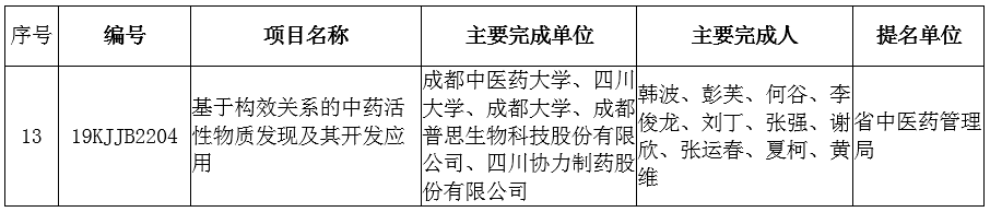 由四川省中醫(yī)藥局提名,我司作為主要完成單位之一申報(bào)的“基于構(gòu)效關(guān)系的中藥活性物質(zhì)發(fā)現(xiàn)及其開發(fā)應(yīng)用”項(xiàng)目獲四川省科學(xué)技術(shù)進(jìn)步獎(jiǎng)(科技進(jìn)步類)一等獎(jiǎng),公司董事長兼總經(jīng)理劉丁先生、原副總經(jīng)理夏柯先生是項(xiàng)目的主要完成人。項(xiàng)目的主要完成單位還有成都中醫(yī)藥大學(xué)、四川大學(xué)、成都大學(xué)和四川協(xié)力制藥股份有限公司。