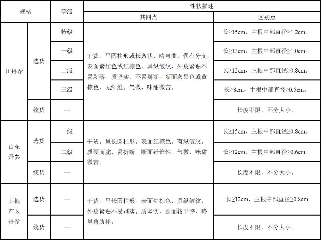 根據(jù)市場(chǎng)流通情況,根據(jù)產(chǎn)地的不同將丹參藥材分為“川丹參”、“山東丹參”“其他產(chǎn)區(qū)丹參”三個(gè)規(guī)格,對(duì)藥材是否進(jìn)行等級(jí)劃分,將丹參分為“選貨”和“統(tǒng)貨”兩個(gè)規(guī)格。在此規(guī)格下主要按照根的直徑進(jìn)行等級(jí)的劃分,即直徑越大等級(jí)越高。