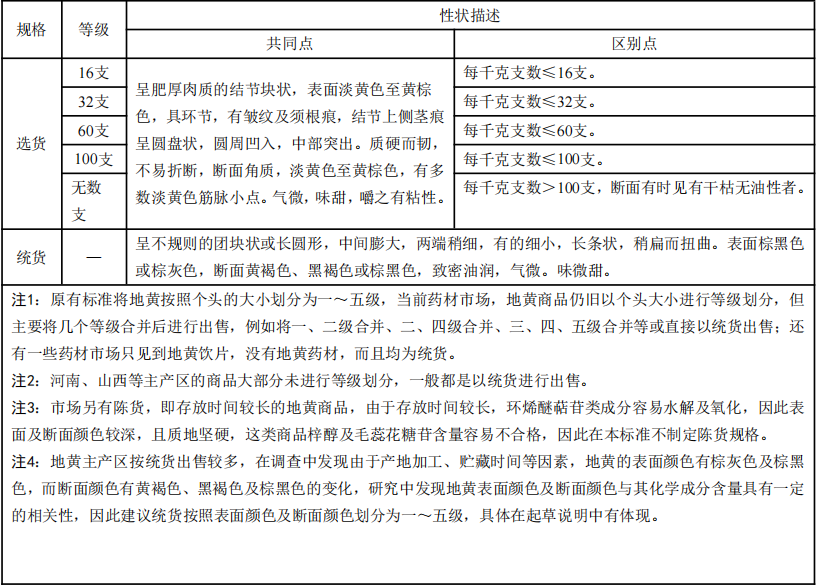 根據(jù)市場流通情況,對藥材是否進行等級劃分,將地黃分為“選貨”和“統(tǒng)貨”兩個規(guī)格。