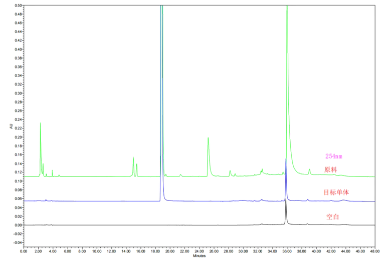 制備液相優(yōu)化:選用內徑150mm系統(tǒng),梯度洗脫結合動態(tài)軸向壓縮柱技術,單批次處理量達50g原料,獲得目標成分120g,純度99.2%(HPLC圖譜見下圖)原料及單體分離圖譜: