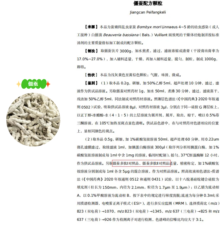 僵蠶為蠶蛾科昆蟲家蠶Bombyx mori Linnaeus 4?5齡的幼蟲感染(或人工接種)白僵菌Beauveria bassiana (Bals.)  Vuillant而致死的干燥體,具有息風(fēng)止痙、祛風(fēng)止痛、化痰散結(jié)的功效。普思生物新品僵蠶多肽I、僵蠶多肽II和僵蠶八肽對(duì)照品,有效對(duì)僵蠶、炒僵蠶配方顆粒進(jìn)行質(zhì)量控制。