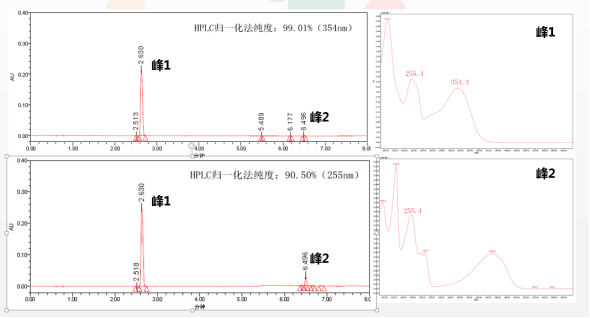 解決方案:選擇對照品與雜質(zhì)具有相似吸收特征的波長,純度結(jié)果會更趨近真實值(如示圖選擇255nm檢測)。