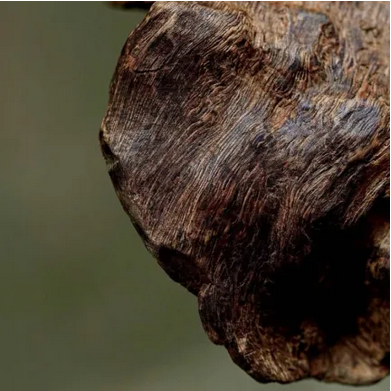 呈不規(guī)則塊、片狀或盔帽狀,有的為小碎塊。表面凹凸不平,有刀痕,偶有孔洞,可見黑褐色樹脂與黃白色木部相間的斑紋,孔洞及凹窩表面多呈朽木狀。質(zhì)較堅實,斷面刺狀。氣芳香,味苦。
