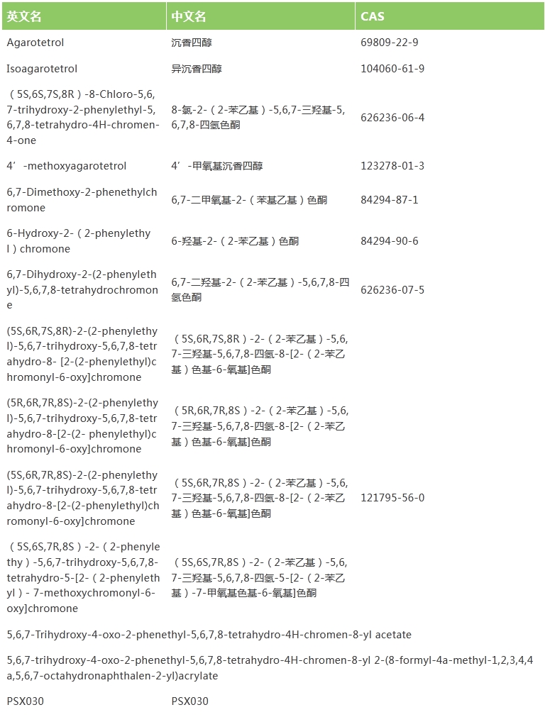 目前我司共有多種沉香色酮類活性成分,針對以下重點推薦的產(chǎn)品,普思生物均現(xiàn)貨供應(yīng),當天發(fā)貨(價格面議)。