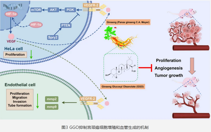 研究者通過酶轉(zhuǎn)化將人參皂苷Ro轉(zhuǎn)化為人參葡萄糖基齊墩果酸(GGO),通過抑制PI3K/AKT/HIF-1α信號通路,減少HIF-1α的核轉(zhuǎn)位和VEGF的表達(dá),從而抑制宮頸癌細(xì)胞的增殖和血管生成。[10]