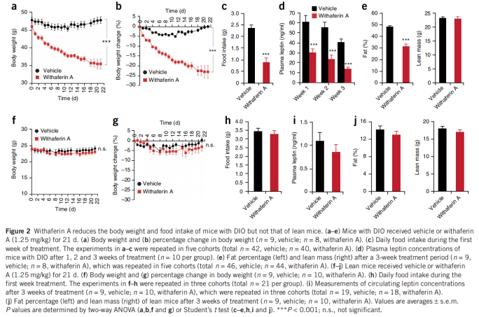 醉茄素A通過(guò)增強(qiáng)瘦素(leptin)敏感性顯著改善飲食誘導(dǎo)肥胖(DIO)小鼠的代謝異常(圖6)。此外,醉茄素A獨(dú)立于瘦素增敏作用,直接改善葡萄糖代謝。為開(kāi)發(fā)新型抗肥胖藥物提供了新思路,具備臨床轉(zhuǎn)化潛力。[5]