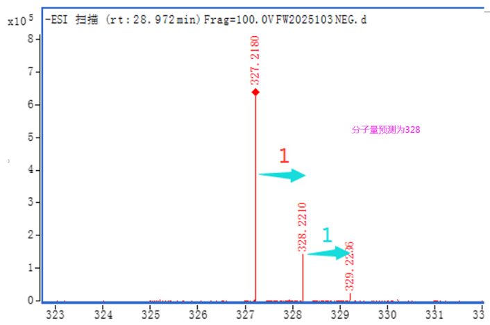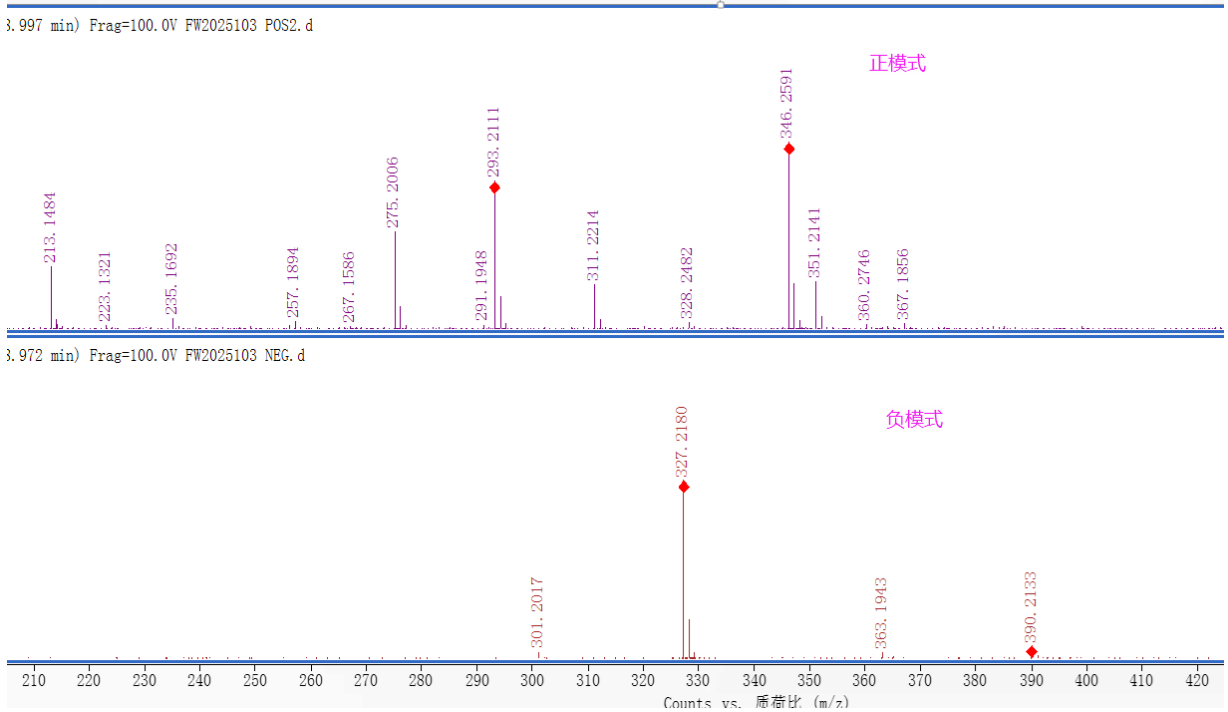 分子量預(yù)測過程中,最容易導(dǎo)致誤判的是圖中出現(xiàn)的看似“相關(guān)”的干擾離子,如[M+NH4]+與[M]+,[M-H2O+H]+與[M +H]+都是間隔18。如下圖中,275與293,328與346均間隔18,單正模式,無法確定分子量為292還是328。但結(jié)合負(fù)模式可確定為328。