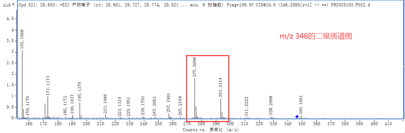 然分子量292的排除需結(jié)合二級(jí)質(zhì)譜圖,可發(fā)現(xiàn)275、293均為分子量328的[M+NH4]+的碎片離子。