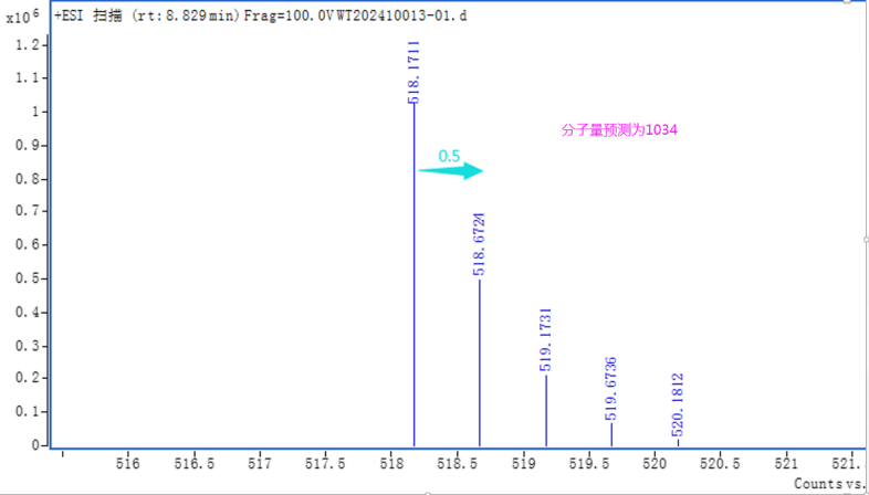 特別要注意的是,同位素間隔除了與元素種類相關(guān),也與電荷態(tài)相關(guān),也是容易出現(xiàn)預(yù)測失誤的關(guān)鍵點(diǎn)。通常情況下,同位素間隔=1/電荷態(tài)。如同位素間隔為0.5,則為雙電荷,分子量往往為分子離子的2倍。