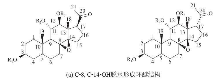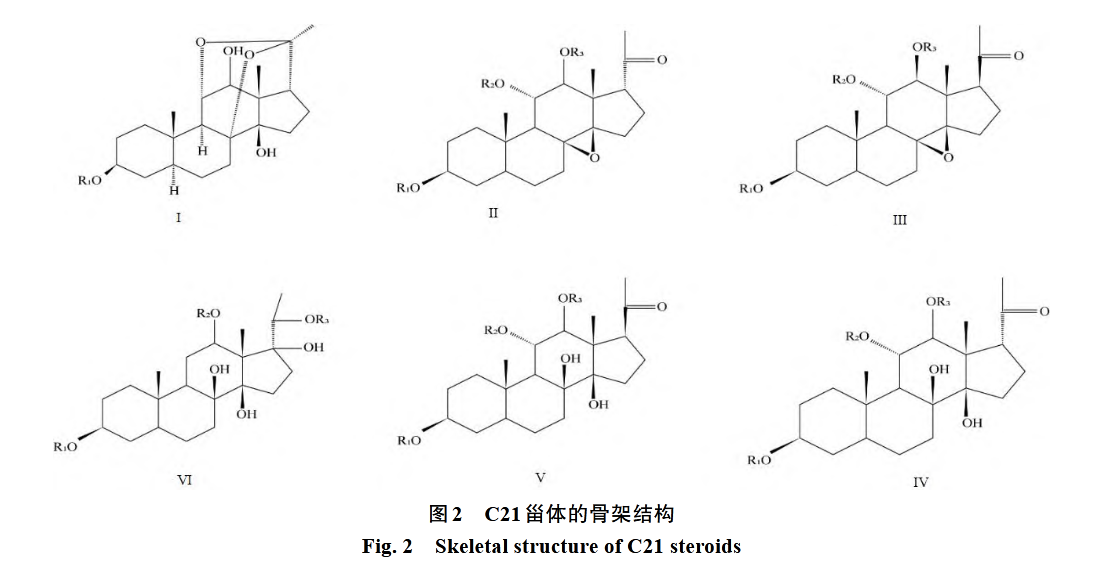 C21甾體皂苷是一類由含有21個(gè)碳原子的孕甾烷衍生物與糖鏈相連形成的苷類分子,其具體骨架類型為6種不同結(jié)構(gòu)的苷元(圖2 I~VI)。C-8、C-14-OH脫水形成環(huán)醚是通關(guān)藤所特有的母環(huán)結(jié)構(gòu)(II型)。