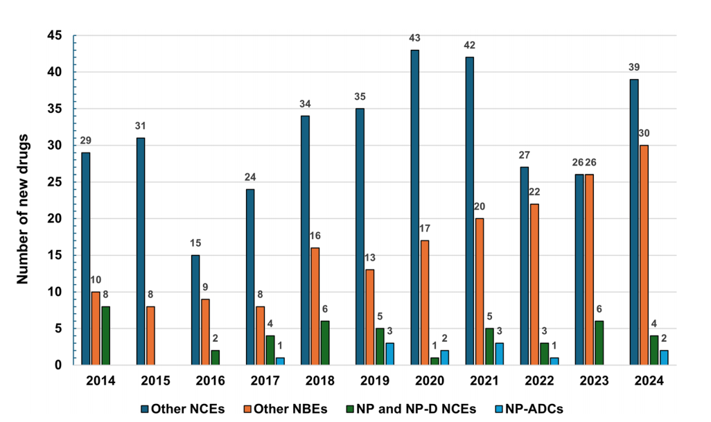 2014-2025 年 6 月,全球共批準(zhǔn) 58 種天然產(chǎn)物相關(guān)藥物,包括 45 種 NP/NP-D 新化學(xué)實體(NCEs)和 13 種 NP-ADCs。在 2014-2024 年全球獲批的 579 種新藥(388 種 NCEs、191 種新生物實體 NBEs)中,天然產(chǎn)物相關(guān)藥物占 9.7%(56 種),其中 NCEs 占 7.6%(44 種),NBEs 中 NP-ADCs 占 6.3%(12 種)。這些藥物年批準(zhǔn)量波動于 0-8 種,年均 5 種,雖非研發(fā)主流,但產(chǎn)出穩(wěn)定。值得關(guān)注的是,中國、印度等國的中小制藥企業(yè)在天然產(chǎn)物衍生藥物首次批準(zhǔn)中的占比持續(xù)提升,成為核心推動力。