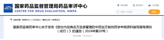國家藥監(jiān)局藥審中心關(guān)于發(fā)布《按古代經(jīng)典名方目錄管理的中藥復(fù)方制劑藥學(xué)申報資料撰寫指導(dǎo)原則(試行)》的通告